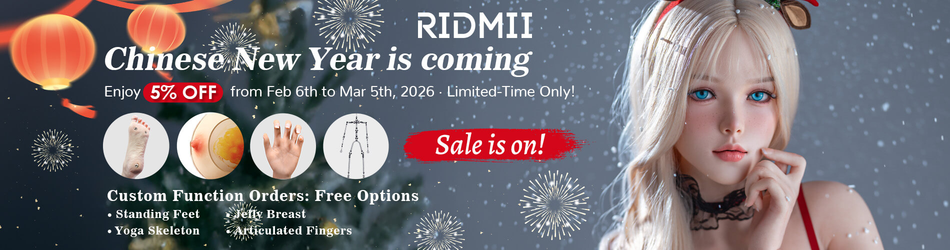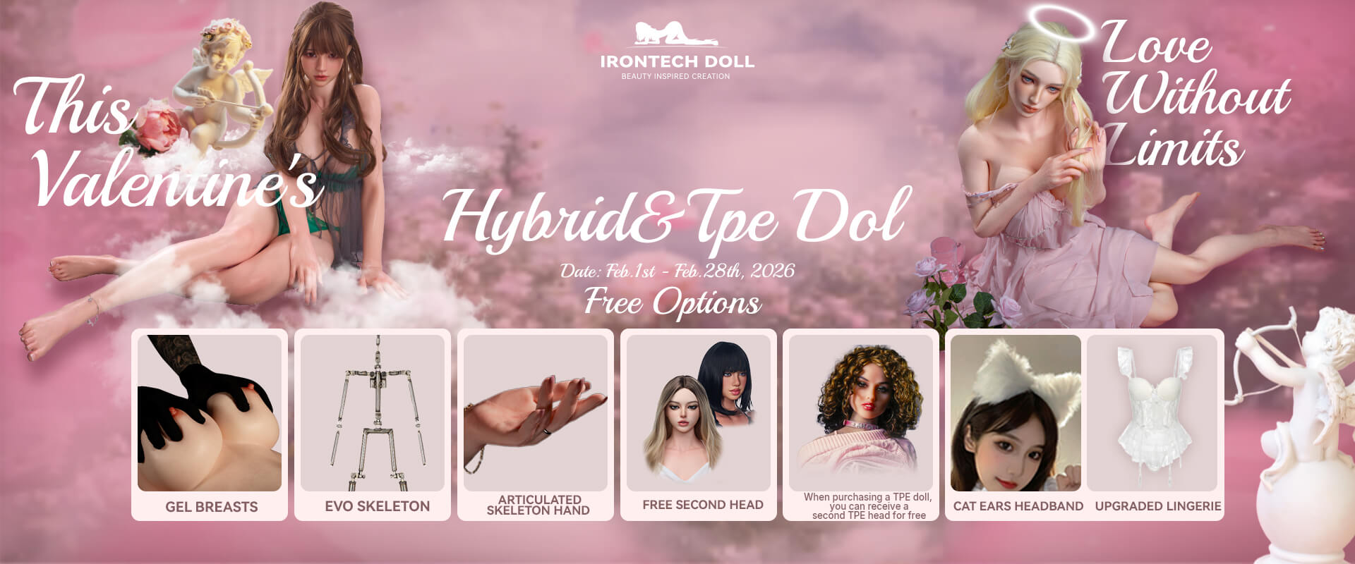 - As part of the BRAND PROMOTION, you can now enjoy FREE: For silicone dolls: a second head, shrugging shoulders, standing feet without bolts, anti-puncture articulated fingers and veins. For TPE and hybrid dolls (TPE + Silicone): a second head, shrugging shoulders, articulated fingers and gel breasts.The promotion runs Feb 1st - 28th, 2026. (Applies to dolls over 140 cm.)