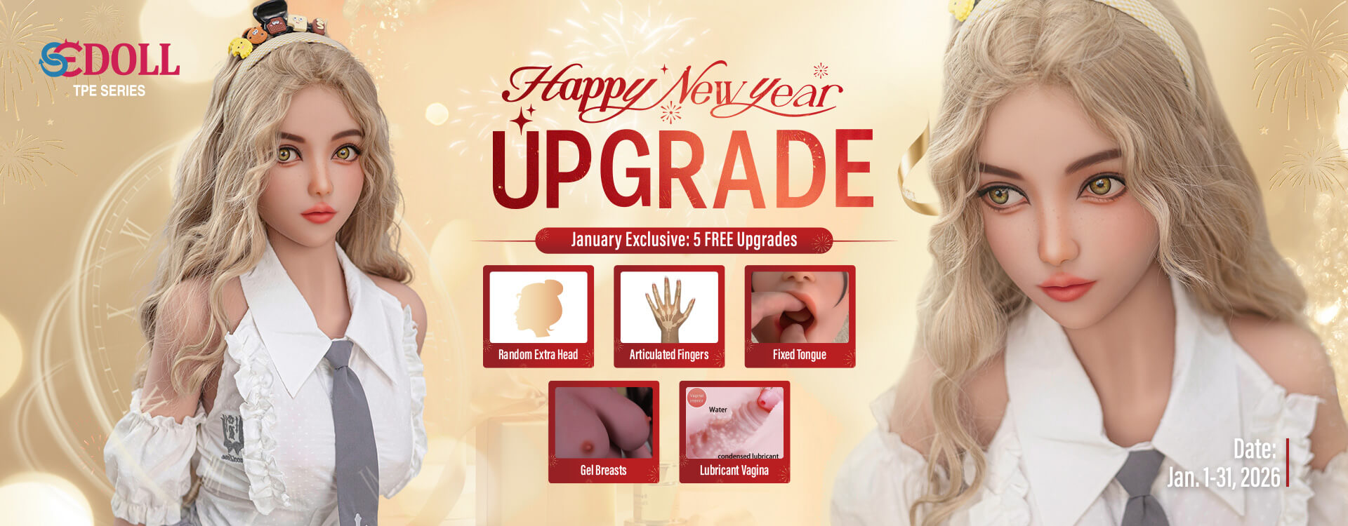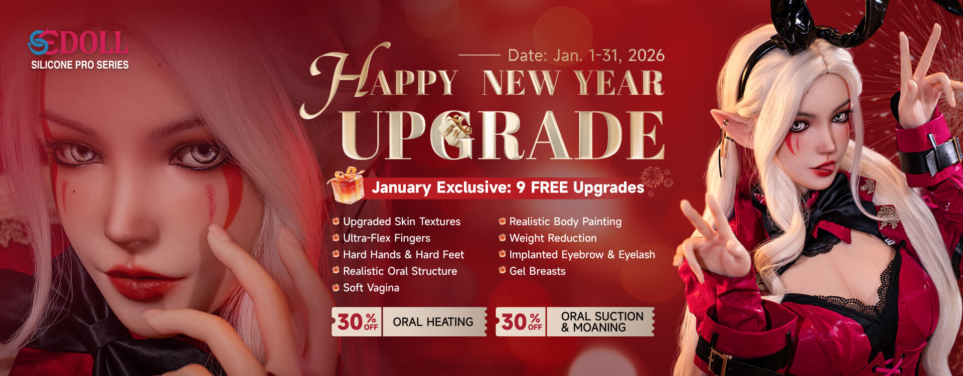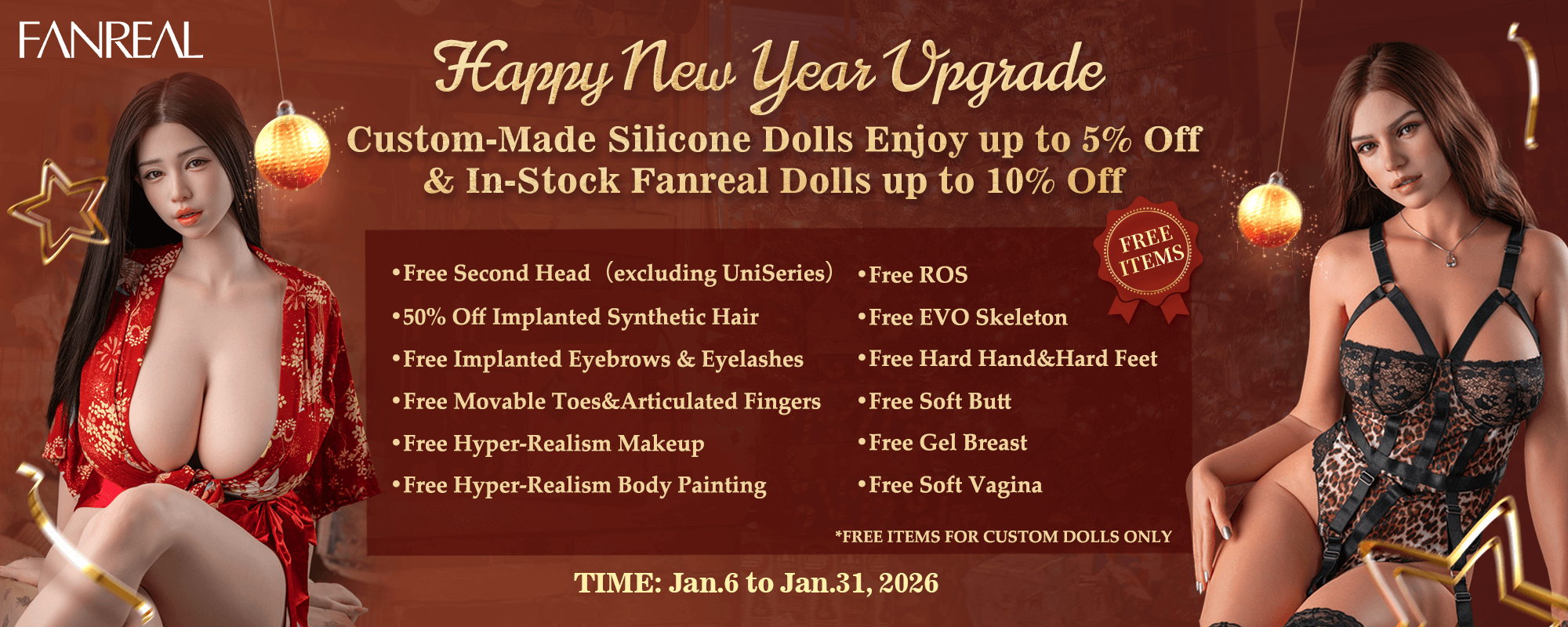 - Brand Offers — get exclusive free configurations with your sex doll! For silicone dolls: soft ass, electric sucking vagina and a second head. For TPE and hybrid dolls (TPE + Silicone): EVO body skeleton, articulated fingers, gel breasts, fixed tongue and a second head. Offer valid until January 20, 2026.