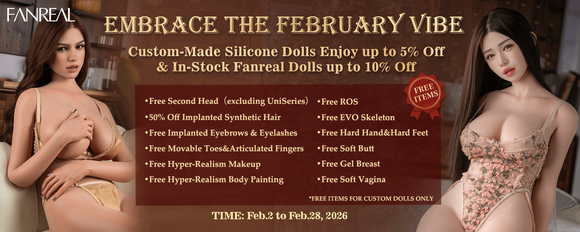 - As part of the BRAND PROMOTION, you can now enjoy FREE:2nd Head, Implanted Synthetic Hair, Gel Breast, Realistic Body Painting, Gel Butt, Standing Feet, Articulated Fingers, Sound touching system, Sucking vagina and ROS jaw. This promotion is valid until 28th of February.